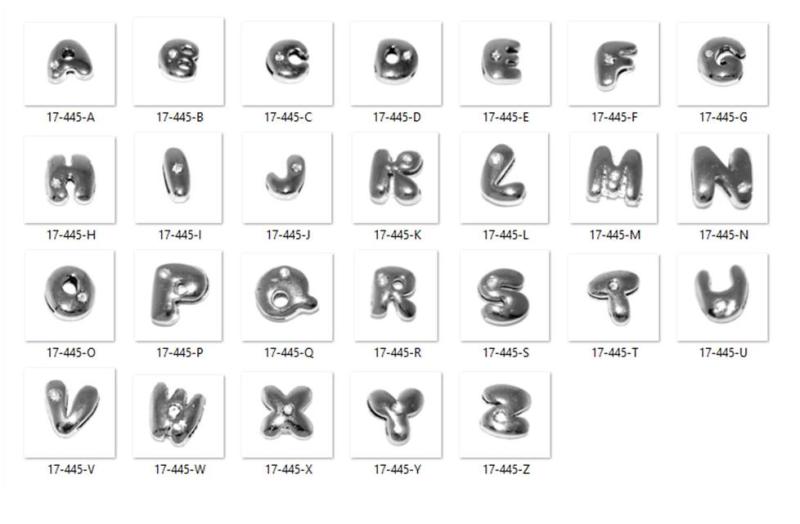 Brickor i stål A-Z som används till brick-hängen eller armband. Bokstaven är ca 1 cm.